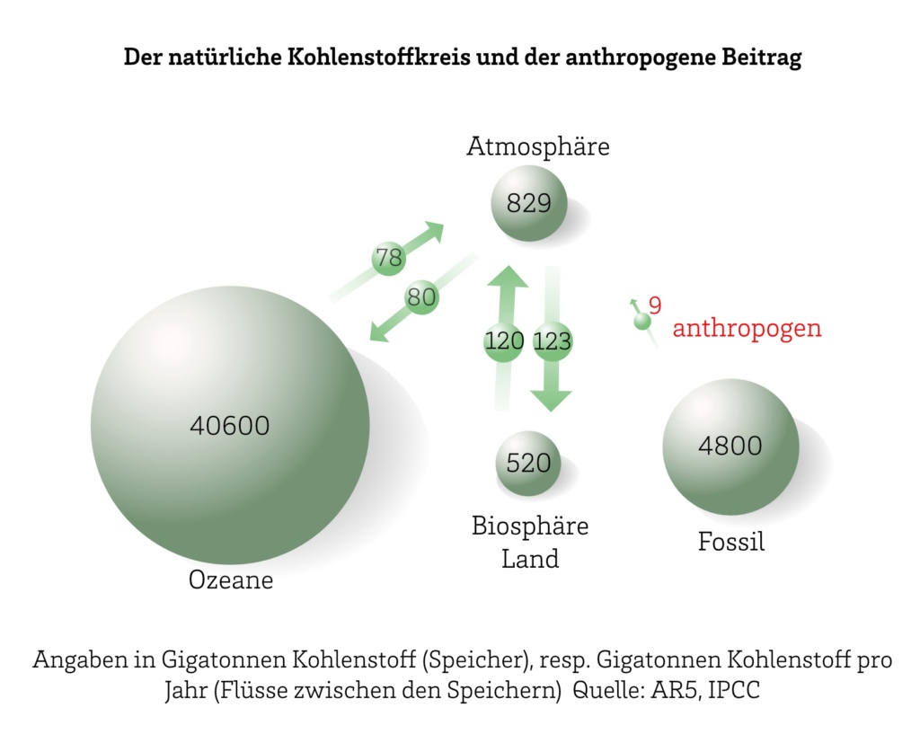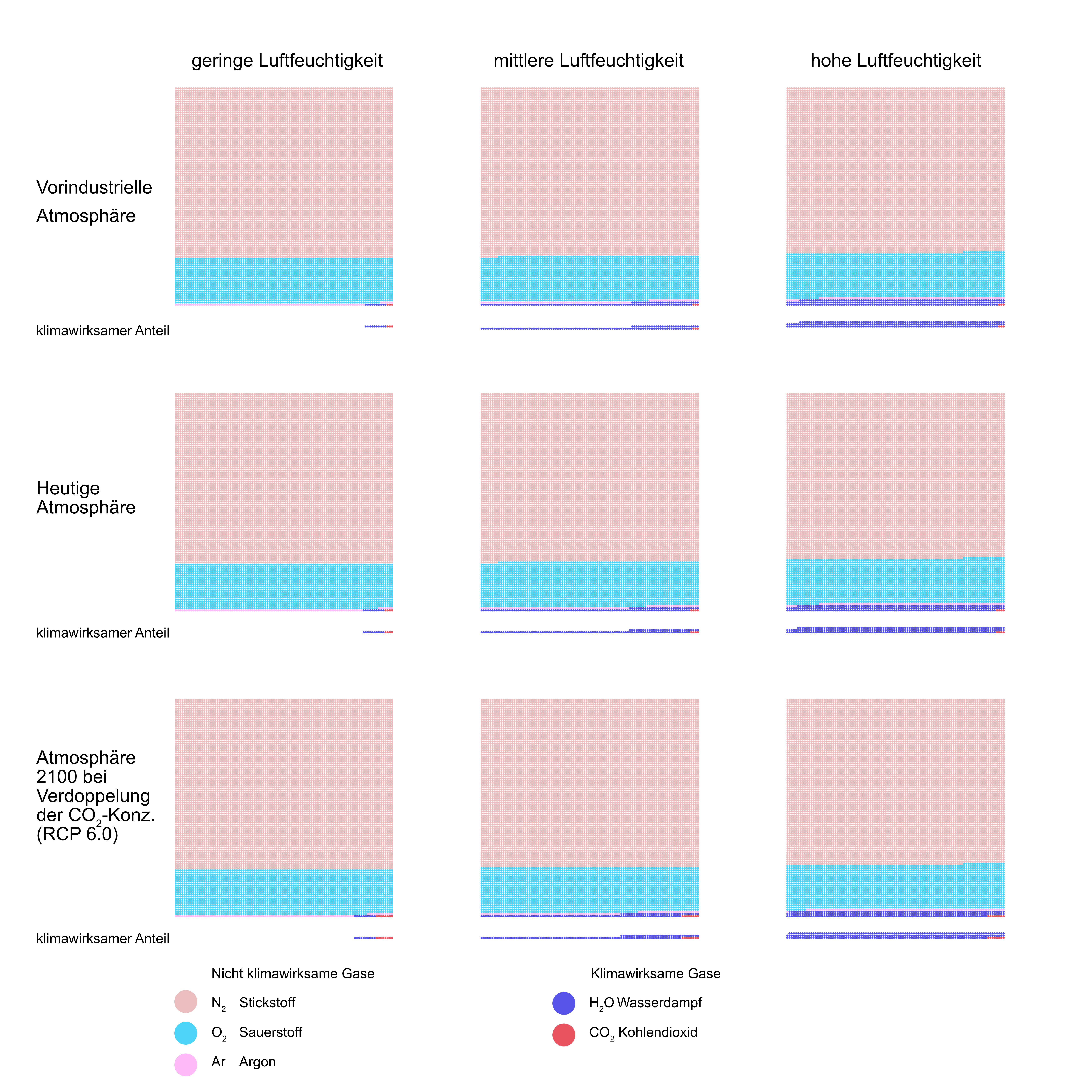 Schwierig in Modelle zu fassen ist die Klimawirkung der Wolken, in welcher nicht die Wasserdampfkonzentration, sondern die Reflektivität des Wolkentyps massgebend ist. In diesem Zusammenhang ist auch die Rolle der Aerosole bei der Wolkenbildung zu erwähnen. Deren Wirkung ist qualitativ verstanden, aber quantitativ kaum erfasst.Die Zunahme der CO2-Konzentration ist korrelierbar mit dem Verbrauch von Kohle, Erdöl und Erdgas. Der Konzentrationsanstieg ist beispiellos, zumindest bestehen aus der früheren Erdgeschichte keine Messreihen, welche einen ähnlich schnellen Anstieg dokumentieren. Desgleichen sind weitgehend menschliche Aktivitäten für die Zunahme der gemittelten Konzentration von Methan, Distickstoffmonoxid (Lachgas-) und Ozon verantwortlich. Die Graphik zeigt gestapelt die Zusammensetzung der Atmosphäre in vorindustrieller Zeit, heute und im Jahr 2100. Die Verdoppelung der CO2-Konzentration bis im Jahr 2100 entspricht in etwa dem Klimaszenario RCP 6.0. Zudem zeigt die Graphik die Veränderung des Anteils klimawirksamer Gase bei geringer, mittlerer und hoher Luftfeuchtigkeit. Die Art der Darstellung wurde gewählt, um die hohe Variabilität und die Dominanz des Wasserdampfs auf das Klima zu veranschaulichen und im Verhältnis mit dem Anstieg der CO2-Konzentration zu zeigen. Zur weiteren Verdeutlichung der hohen Variabilität klimawirksamer Gase sind diese unter jedem Abbild der Gesamtatmosphäre noch einmal separat aufgeführt.