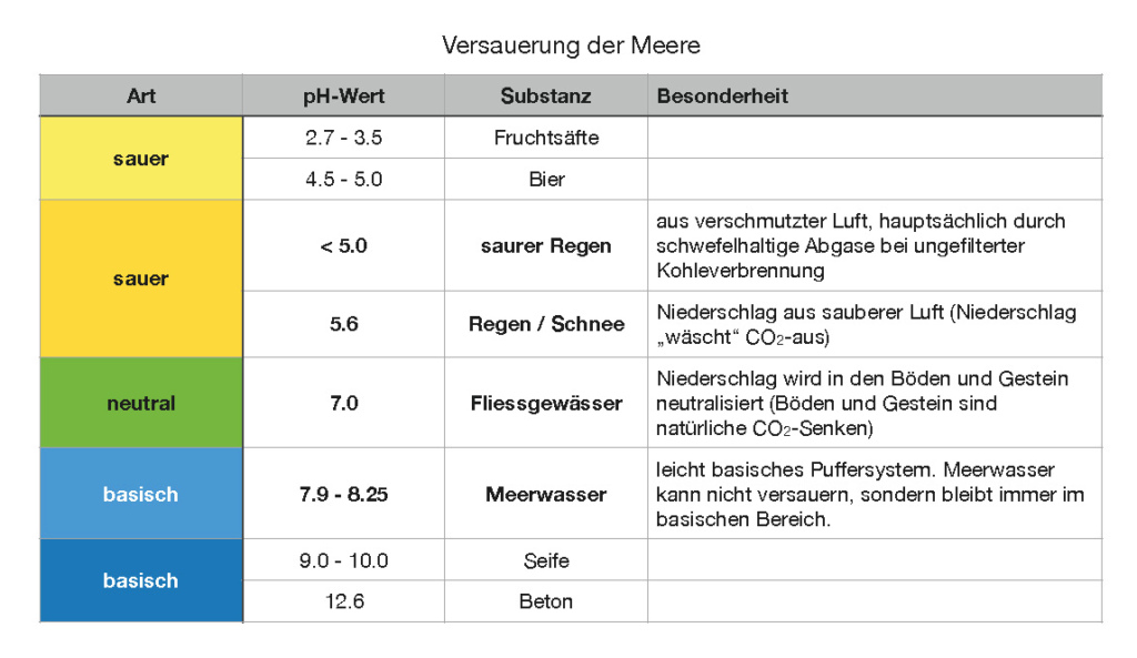 Fliessgewässer und Niederschläge senken lokal am Eintragungsort den pH des Meereswassers, was jedoch nicht zu einer Versauerung der Meere führt. Meerwasser ist aufgrund der Gegenwart von Natrium-, Calcium- und Magnesium- Ionen sowie Karbonaten und Hydrogenkarbonat ein leicht alkalisches Puffersystem.
